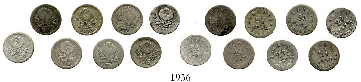 Lot of 8 Bogota, Colombia, 2-1/2 centavos: 1872, 1873, 1875, 1877, 1878 (2), 1879, 1880. R-249; KM-169. 0.6 to 0.7 gram each. VF or so on average, several lightly toned, no problems. Pedigreed to the Herman Blanton collection.