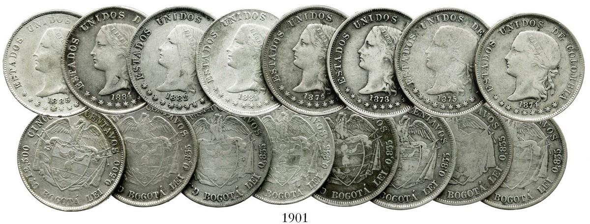 Lot of 8 Bogota, Colombia, 50 centavos: 1874, 1875, 1878, 1879, 1881, 1882, 1884, 1885. 11.8 to 12.4 grams each. AVF on average, most lightly toned, one with flaw near rim but otherwise a problem-free group from a popular series. Pedigreed to the Herman Blanton collection.