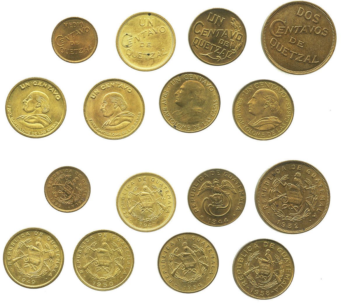 Lot of 8 Guatemalan brass minors: 2c 1932; 1c 1944, 1947, 1949, 1950, 1954 and 1958; and 1/2c 1932.