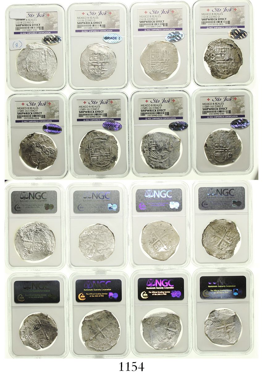 Lot of 8 Mexico City, Mexico, cob 8 reales, Philip II and III, assayers F or D where visible, all Grade 2. Solid coins with at least decent shields and/or crosses despite light to moderate corrosion and flatness. With certificates from the salvager and booklet The Numismatic Collection of the Sao Jose (1622), by Alejandro Mirabal (Arqueonautas, 2012), with accompanying DVD. Recovered from: Sao Jose, sunk in 1622 off Mozambique, east of Africa