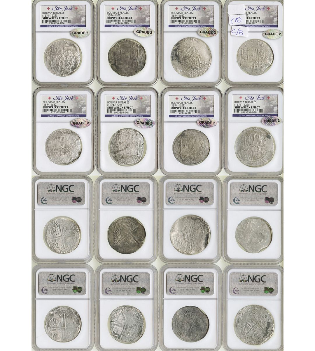 Lot of 8 Potosi, Bolivia, cob 8 reales, Philip II and III, assayers not visible, all Grade 2. Solid coins with at least decent shields and/or crosses despite light to moderate corrosion and flatness. With certificates from the salvager and booklet The Numismatic Collection of the Sao Jose (1622), by Alejandro Mirabal (Arqueonautas, 2012), with accompanying DVD. Recovered from: Sao Jose, sunk in 1622 off Mozambique, east of Africa