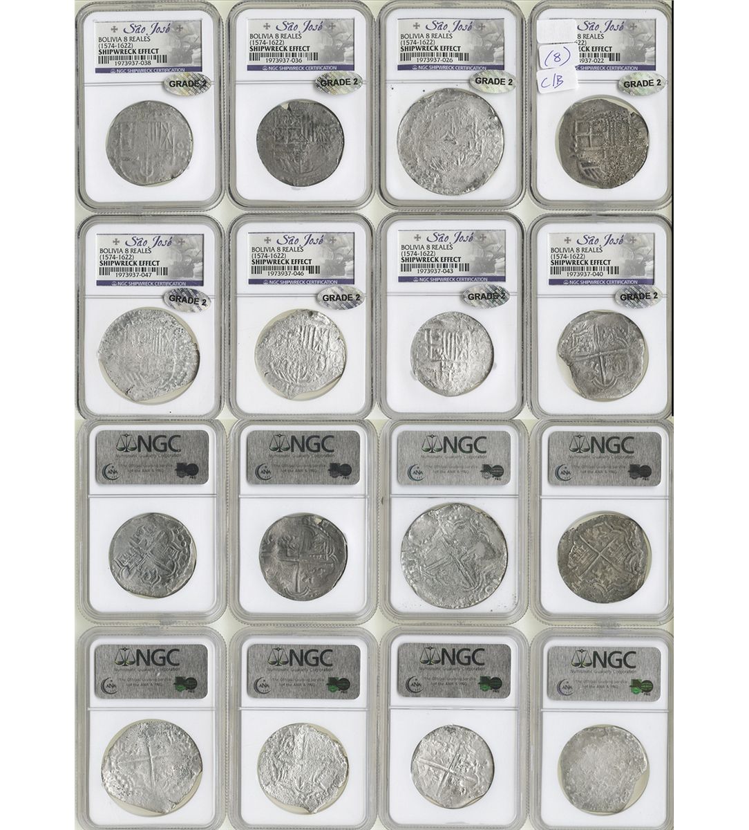 Lot of 8 Potosi, Bolivia, cob 8 reales, Philip II and III, assayers not visible, all Grade 2. Solid coins with at least decent shields and/or crosses despite light to moderate corrosion and flatness. With certificates from the salvager and booklet The Numismatic Collection of the Sao Jose (1622), by Alejandro Mirabal (Arqueonautas, 2012), with accompanying DVD. Recovered from: Sao Jose, sunk in 1622 off Mozambique, east of Africa