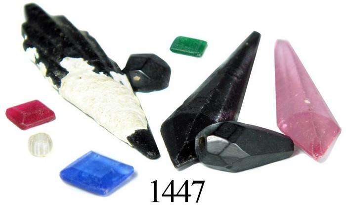 Lot of 8 glass beads, drops and stones. 9.6 grams, up to 1½" long. This lot contains two beads, one small and clear and spherical bead and the other long and black and faceted; 2 long, black "drops" (one with bright white coral encrustation) plus a clear pink "drop"; and 4 small, faceted pieces for mounting, one square and blue, two rectangular (green and red), and one black and round and domed. All are a bit worn but intact, which is rare for shipwreck glass. Recovered from: Nuestra Señora de los Milagros, sunk in 1741 off the Yucatán Peninsula of Mexico. Pedigreed to Art McKee's Sunken Treasure Museum, with certificate.