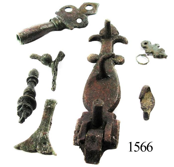 Lot of 8 miscellaneous bronze items, including a key and large latch. 158 grams total, up to 5". A hodge-podge of items, some identifiable, some not, but all at least somewhat patinated. Found in a Spanish colonial area in the southern Caribbean, ca. 1590.