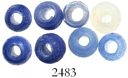 Lot of 8 small glass beads. 5.3 grams total, up to 3/8" in diameter. Mostly spherical and with some design, one translucent and the others deep blue. From the Spanish 1733 Fleet, Florida Keys, pedigreed to the Marty Meylach collection.