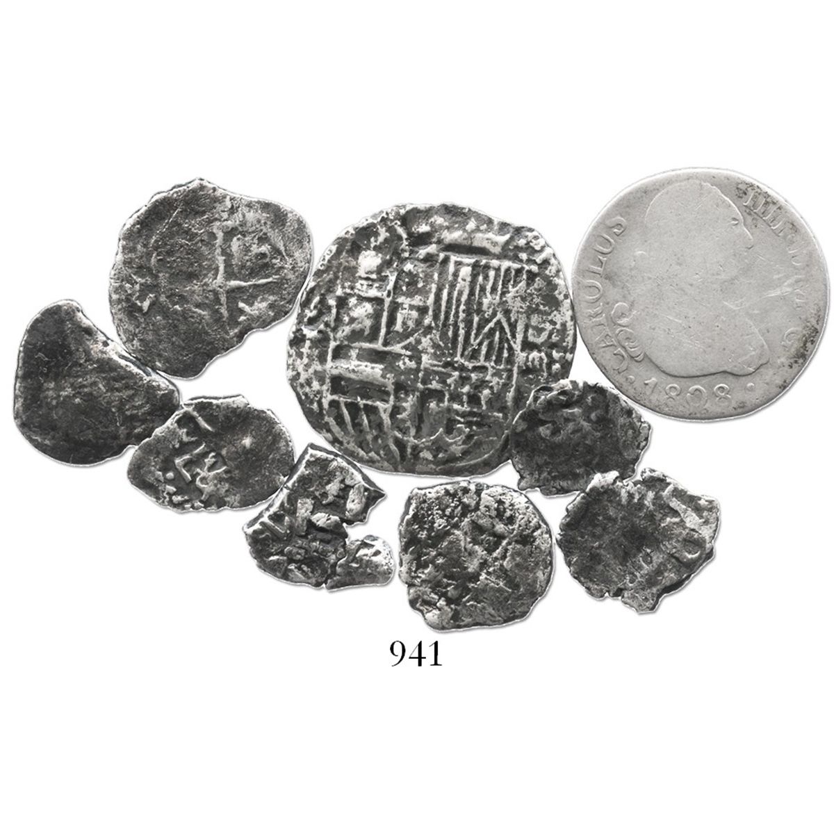 Lot of 8 small silver cobs (various mints) and 1 Spanish bust 2R. 23.2 grams total. Decent but salvaged 4R Potosi Philip II, decent 1R Potosi 1715Y, plus worn Madrid bust 2R 1808AJ, but the other 6 coins are all low-end 1R and 1/2R cobs, artificially toned.