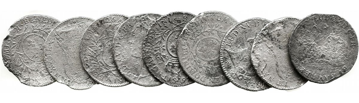 Lot of 9 French 1/2 ecus of Louis XV, various mints and dates (1726-42). 115.2 grams total. Lightly to moderately corroded and somewhat silvery (no toning) but with mostly readable details, a couple with edge problems, scarce provenance. Recovered from: Dromadaire, sunk in 1762 off the Cape Verde Islands, west of Africa