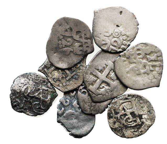 Lot of 9 Lima, Peru, cob 1/2R of Philip V, various dates. 12.3 grams total. Nice little date-run of problem-free coins, all toned and F-VF on average, consisting of: 1702 (3 specimens, with distinctive monogram), 1719, 1720, 1721, 1726, 1727 and 1742V.