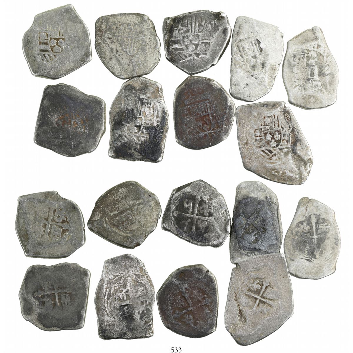 Lot of 9 Mexico City, Mexico, cob 8 reales, Philip V, assayer J (where visible). 216.32 grams total. Solid coins but all a bit worn, still with mostly clear shields and crosses, and all with a dark sheen of encrustation as not completely cleaned. With small, hand-signed Fisher certificates from the late 1960s or early 1970s. Recovered from: Spanish 1715 Fleet, east coast of Florida