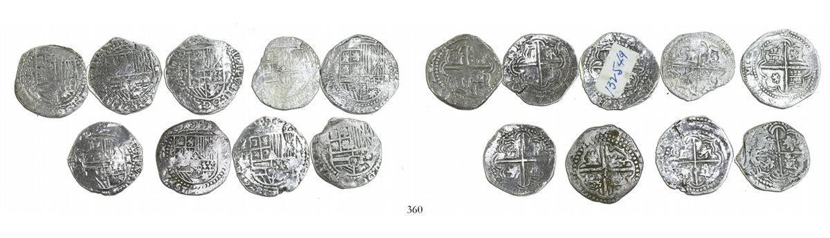 Lot of 9 Potosi, Bolivia, cob 2 reales, Philip II and/or III, various assayers (where visible), all Grade 1, two with original tags but no certificates. Generally good shields and crosses, most corrosion-free or close to it, most with visible assayers. With Fisher certificates #132363, 132549, 133159, 133326, 136884, 150180 and 231370 and two with just tags 221966 and 236544. Recovered from: Atocha, sunk in 1622 west of Key West, Florida