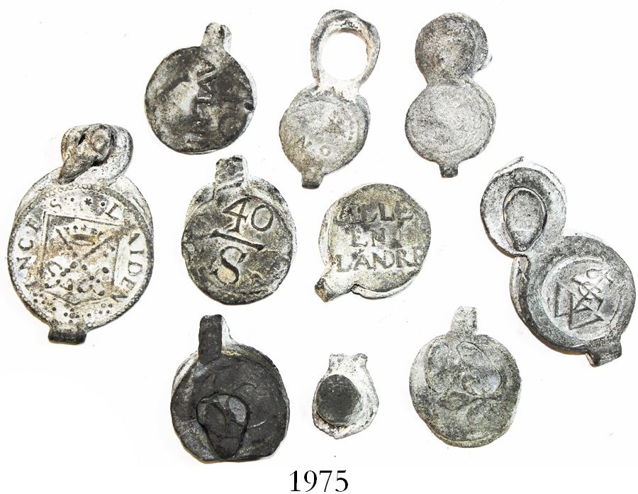 Lot of 9 small lead cloth-bale seals (1500s-1600s). 61.2 grams total, up to 1-1/2" long. Intact pieces of a folded-over design, very light gray in color, all with at least some discernible detail (one quite clear) consisting of lettering and symbols.