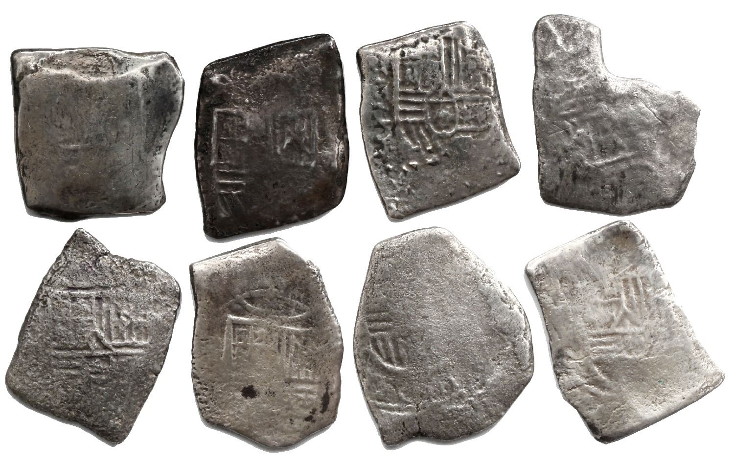 Lot of eight Mexico City, Mexico, cob 8 reales, Charles II, assayers not visible. KM-46. 146.05 grams total. All corroded but solid with decent details, several interesting shapes in the group. With generic certificates hand-signed by the salvors. Recovered from: Joanna, sunk in 1682 off South Africa