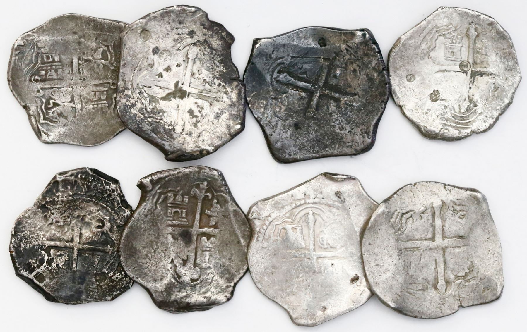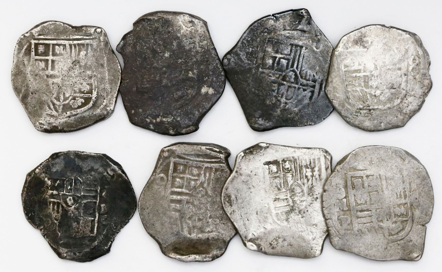 Lot of eight Mexico City, Mexico, cob 8 reales, Philip IV, assayer P (where visible), most with small chopmarks as from circulation in Asia. KM-45. 212.96 grams total. Fine on average, a couple silvery but the rest toned, a few with corrosion.