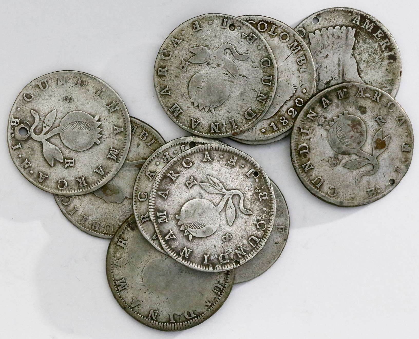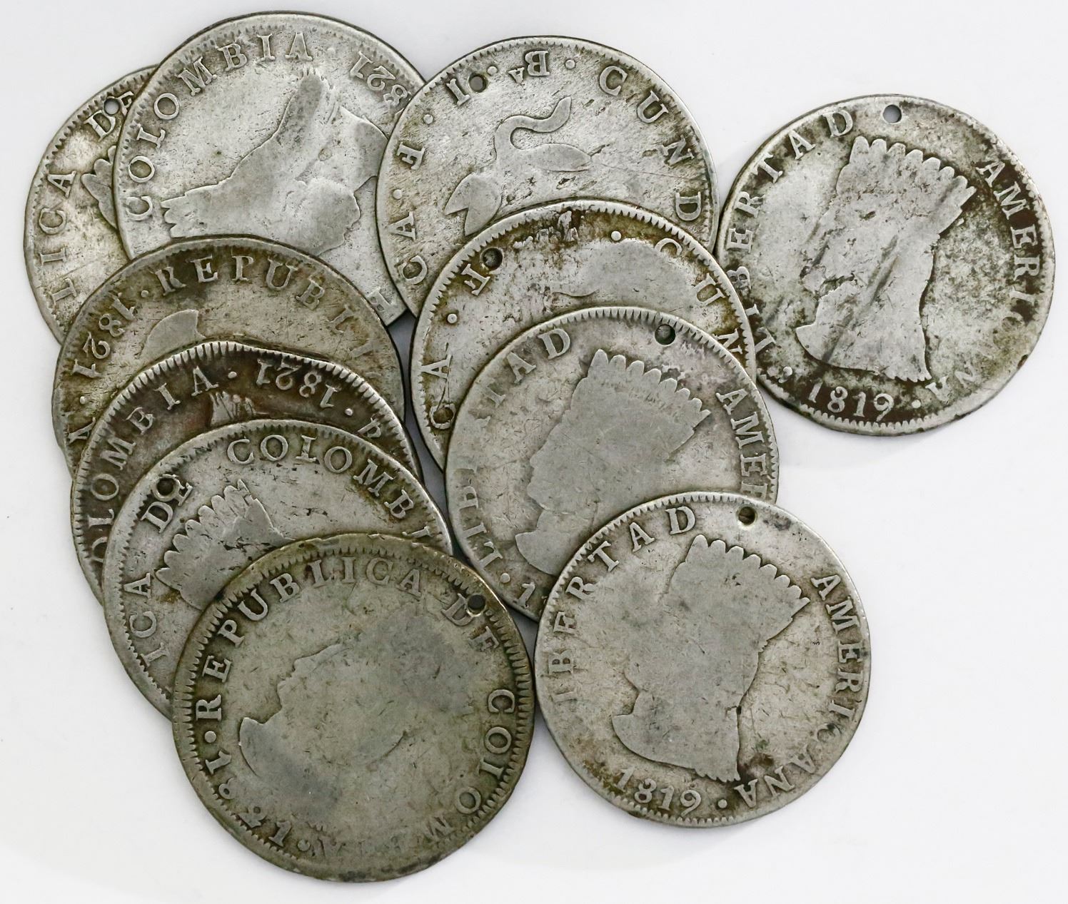 Lot of eleven Bogota (Cundinamarca), Colombia, 8 reales, 1819-1821JF. 250.20 grams total. Total of three 1819JF "LIBERTAD AMERICANA," one 1820JF without mintmark (rare), five 1821JF with mintmark and dot below A, one 1821JF with mintmark and no dot below A, and one 1821JF without mintmark (rare). All holed and generally VG to Fine.