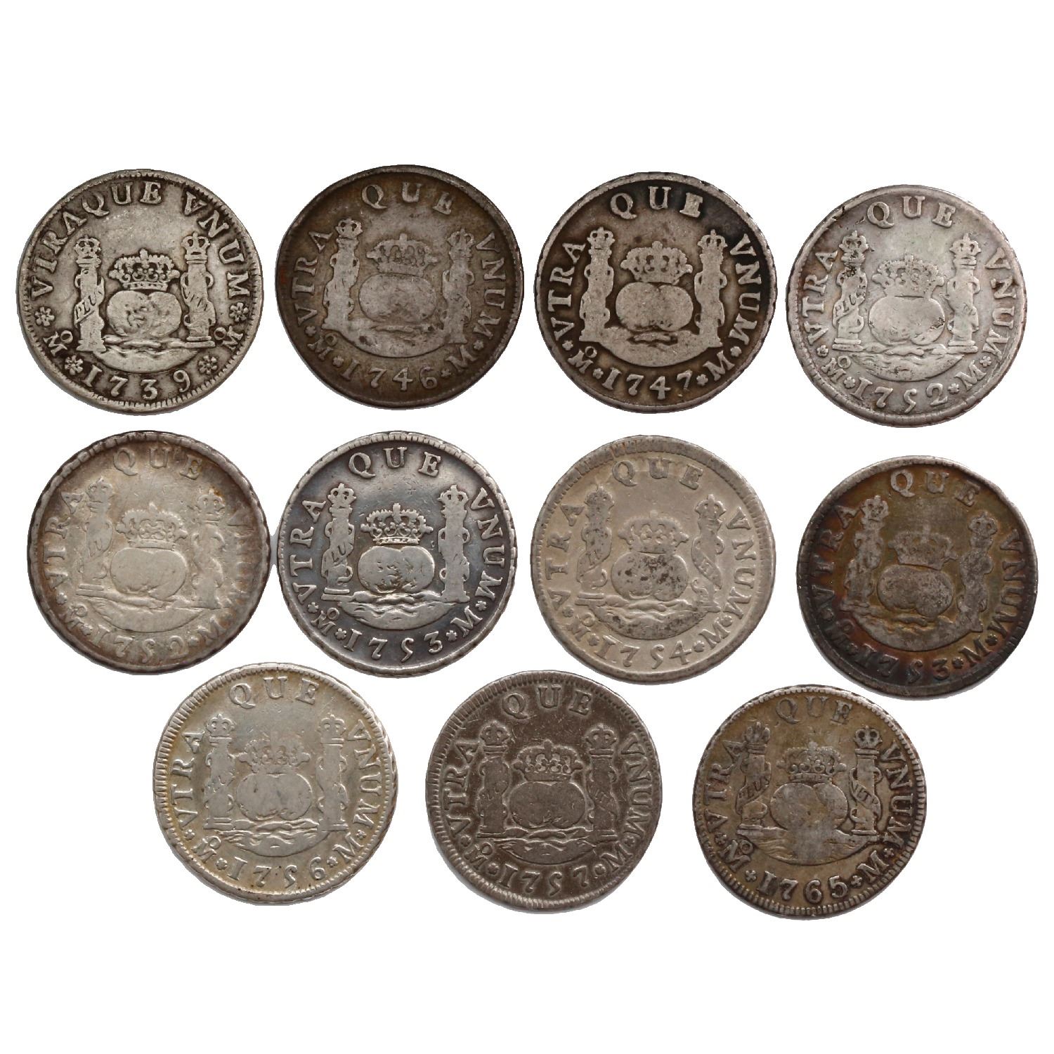 Lot of eleven Mexico City, Mexico, pillar 2 reales, Philip V through Charles III, various dates and assayers. 71.16 grams total. Philip V: 1739 MF, 1746 M, 1747 M; Ferdinand VI: 1752 M (two), 1753 M (two), 1754 M, 1756 M, 1757 M; Charles III: 1765 M. All generally around Fine or slightly better, a few with cleaning or minor marks but no major problems.