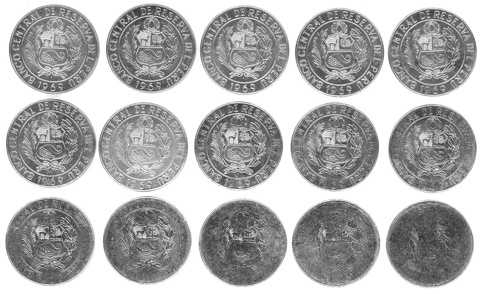 Lot of fifteen Peru, copper-nickel 5 soles, 1969, strike-pressure progression set, unique. KM-252. Interesting collection of numbered progression strikes showing the effects of different striking pressures. The coin labelled "1" exhibits very weak design elements, while subsequent strikes show more detail and fewer weak areas until fully struck up by coin "15." All coins UNC, with luster and very light toning. Possibly unique, the only strike-progression sets of any country we have seen on the market except for a companion set of Peru 10 soles 1969 sold in our Auction #24. Worthy of study and possible encapsulation together with the different striking numbers.