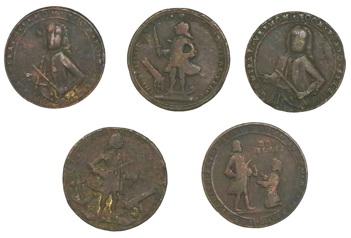 Lot of five Great Britain copper-alloy small-size medals of Admiral Vernon, 1739, Porto Bello (vario