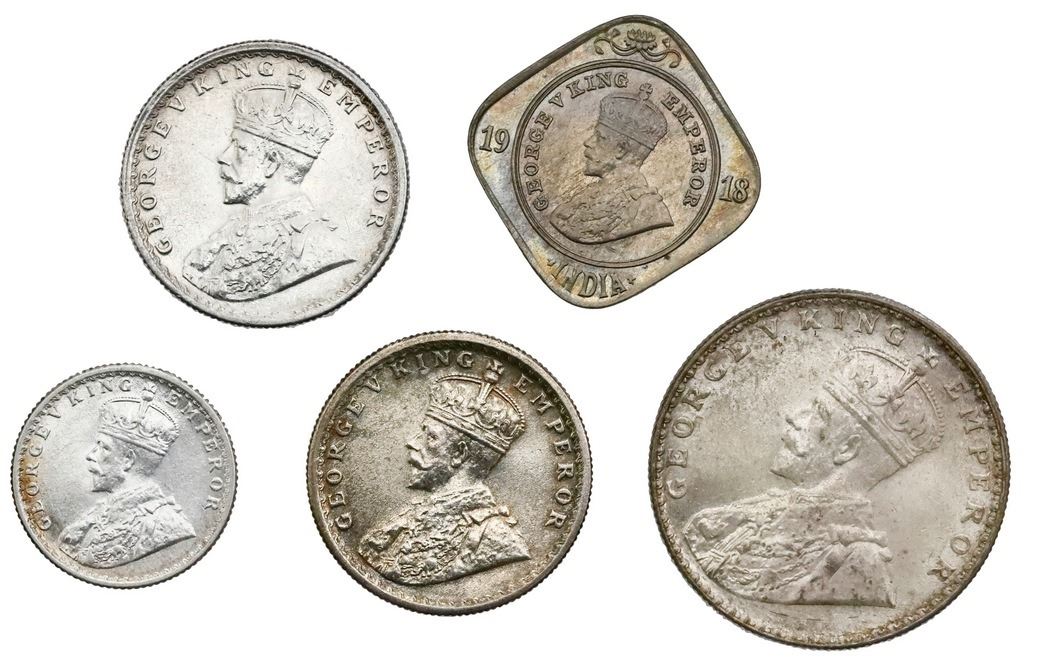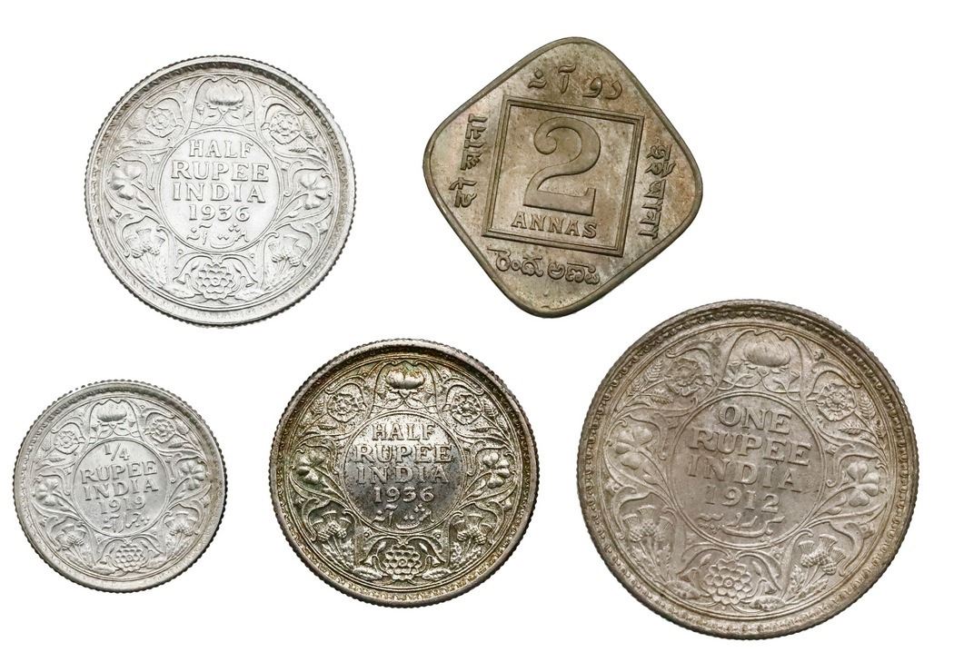 Lot of five India (British) coins of George V: Bombay, rupee, 1912; Calcutta, 1/2 rupee, 1936 (two); Calcutta, 1/4 rupee, 1919; Bombay, copper-nickel 2 annas, 1918. Around AU to UNC, some with toning, a few better types.