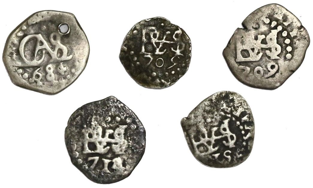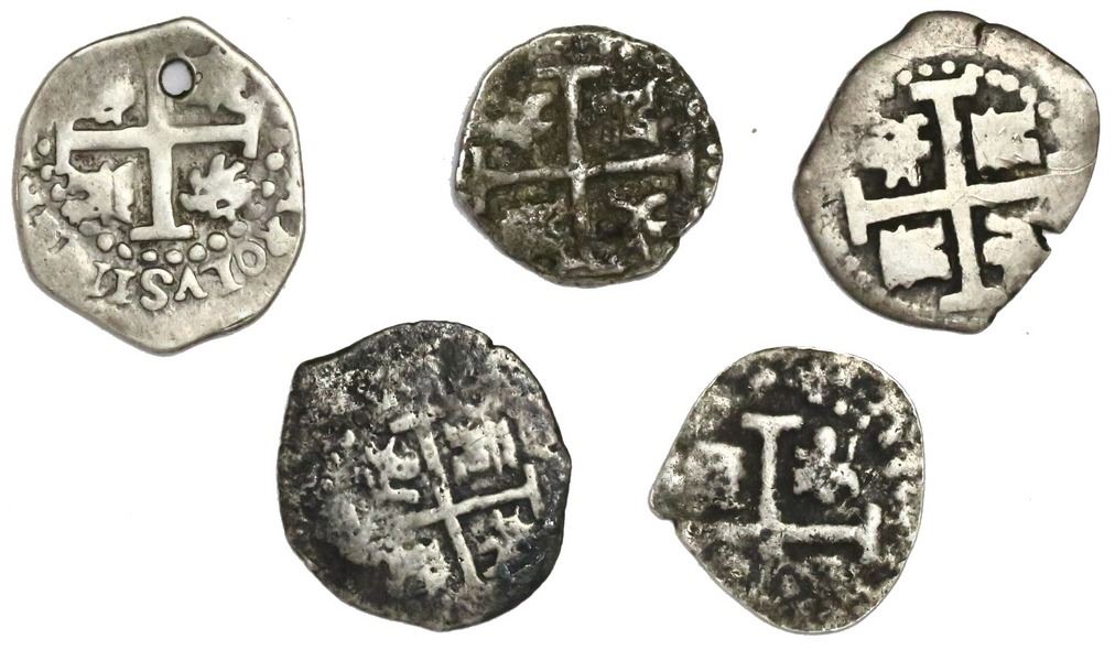 Lot of five Lima, Peru, cob 1/2R: 1684, 1705, 1709, 1714/3 and 1715. 6.71 grams total. Toned AVF on average, three with surface porosity and one holed, clear dates and generally good crosses and monograms.