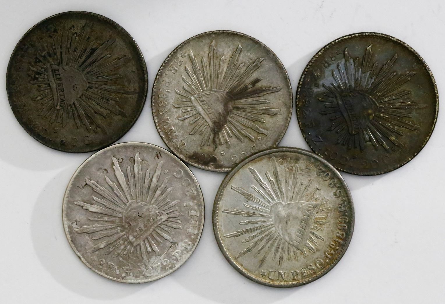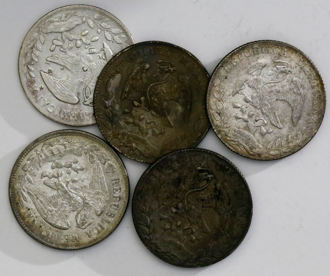 Lot of five Mexican cap-and-rays 8 reales, various mints and dates: 1872HoPR, 1887PiMR, 1892ZsFZ, 1893MoAM and 1899GoRS. 134.53 grams total. The 1872 and 1893 have chopmarks but otherwise these are AU or so.