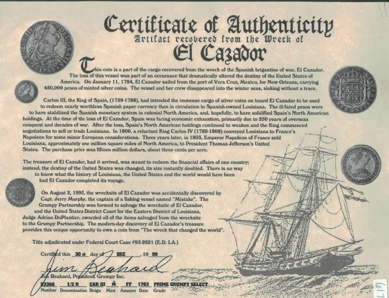 Lot of five Mexico City, Mexico, bust 1/2R, Charles III, 1783FF. KM-69.2; CT-1775. 7.57 grams total. Choice specimens with UNC details and minimal corrosion, non-toned. With original 1999 certificates from the salvagers (Grumpy, Inc.). Recovered from: Cazador, sunk in 1784 off New Orleans