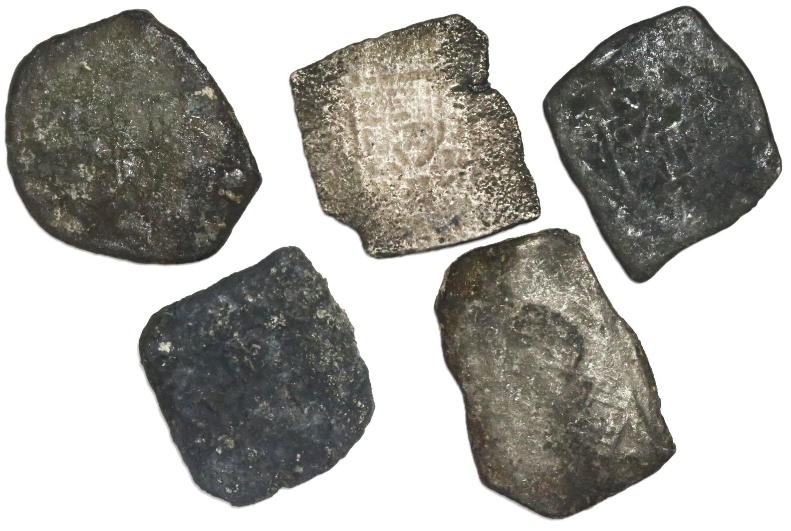 Lot of five Mexico City, Mexico, cob 8 reales, Philip V, assayers not visible, all uncleaned and oxidized. KM-47. 105.37 grams total. One coin is a heavily corroded black "biscuit" while the other four are slightly less corroded with some encrustation. With certificates. Recovered from: Spanish 1715 Fleet, east coast of Florida