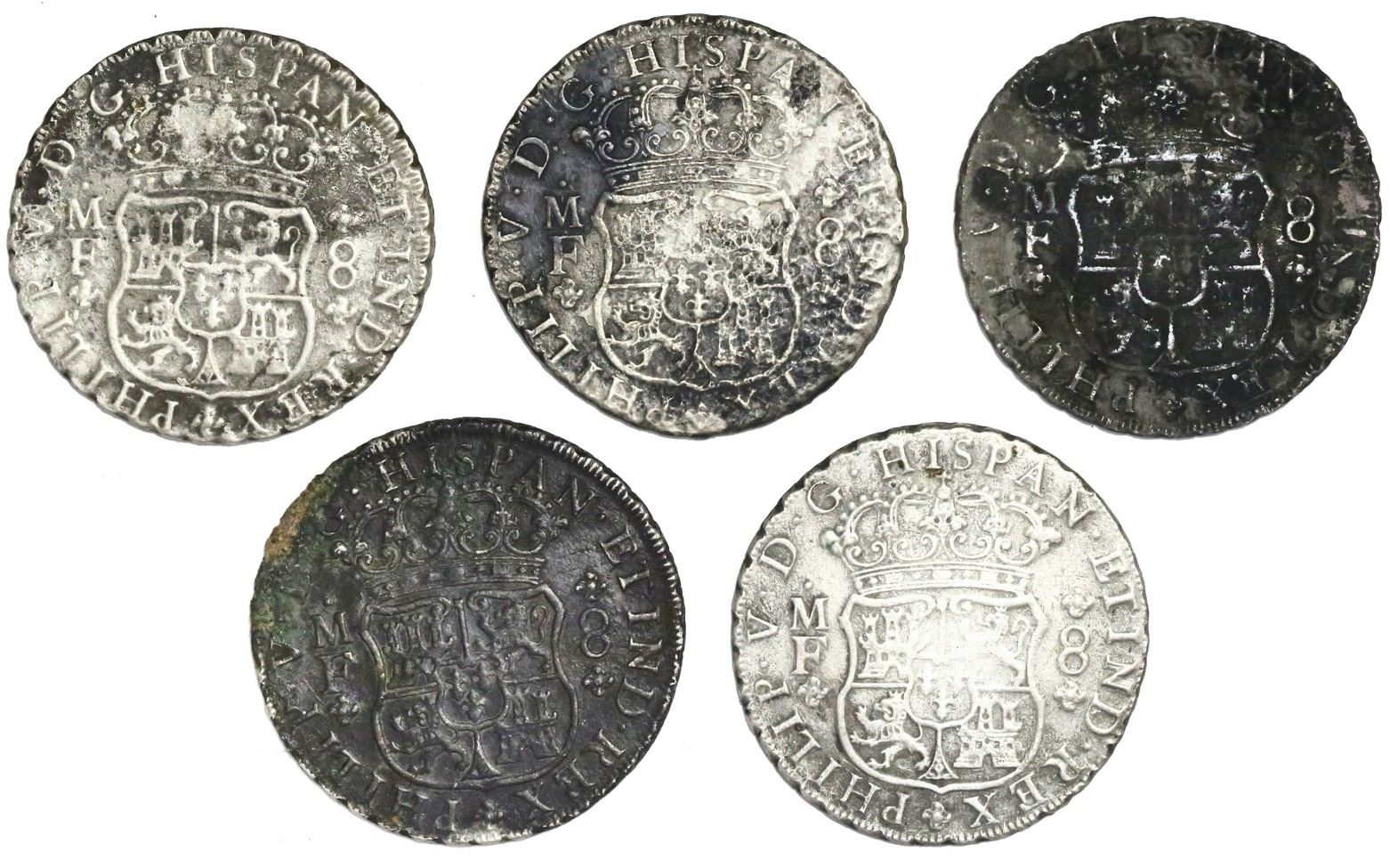 Lot of five Mexico City, Mexico, pillar 8 reales, Philip V, 1737MF. KM-103; Cal-1446. 122.46 grams total. Some corrosion and varying amounts of dark encrustation. With original (generic) certificates from the salvagers. Recovered from: Rooswijk, sunk in 1739 southeast of England