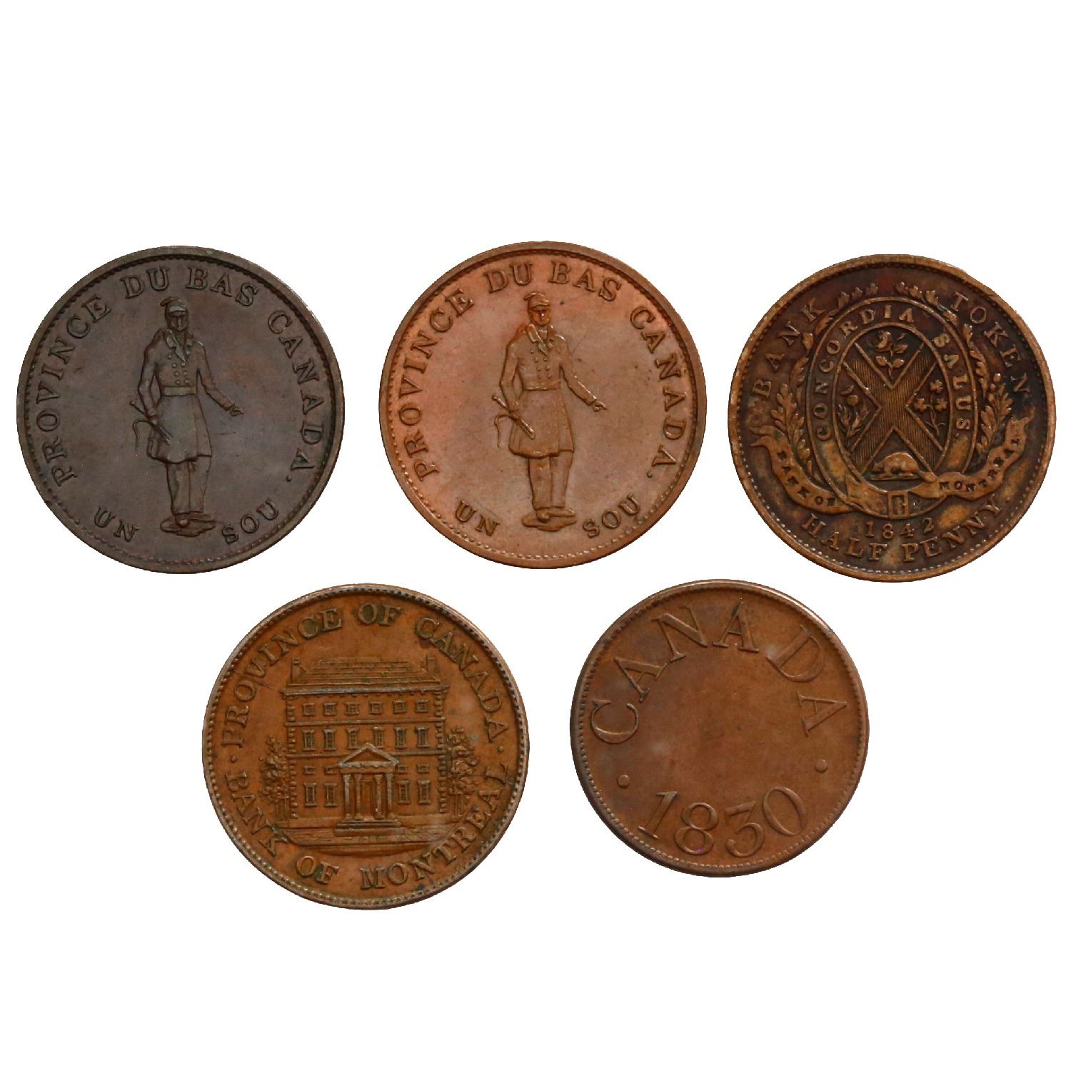 Lot of five Montreal, Canada, copper 1 sou / half penny tokens: two City Bank "habitant" tokens, 1837, one ex-Loye, ex-Cooper; two Bank of Montreal "front view" tokens, 1842 (heavy trees, long-nose beaver, ex-Griffin; and small trees, short-nose beaver, ex-Cooper); and James Duncan & Co, 1830, ex-Oppenheim. Br-522, C-2c var and C-20, LC-8A2 and 8D2; Br-527, PC-1B4 and 1B5; Br-532, LC-13A. All AU or UNC, the Courteau-2c without defect or double-cutting of the S in BAS (nice dark patina), the Courteau-20 with hairline die-break from whip to habitant’s body (not mentioned by Courteau), which almost duplicates the whip (some original luster and red color), the two 1842's with prominent die-breaks on obverse. Pedigreed to the Warren Baker Collection of Canadian coins and tokens, and to the Loye Collection, the Richard Cooper Collection (Geoffrey Bell auctions of October 2015, lot 103, and April 2016, lot 735), the Jack Griffin Collection, and the Michael Oppenheim Collection (9/2019).