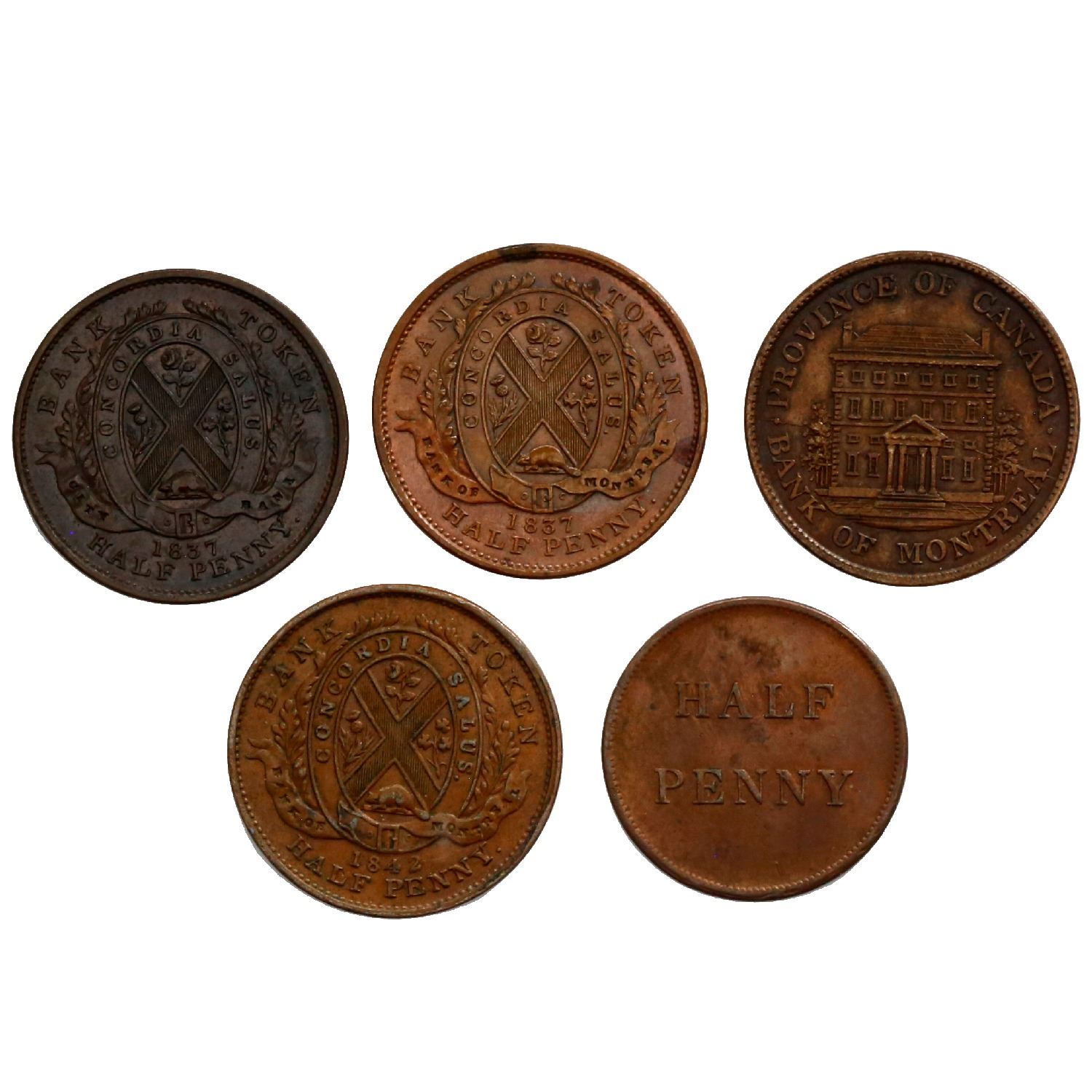 Lot of five Montreal, Canada, copper 1 sou / half penny tokens: two City Bank  habitant  tokens, 183