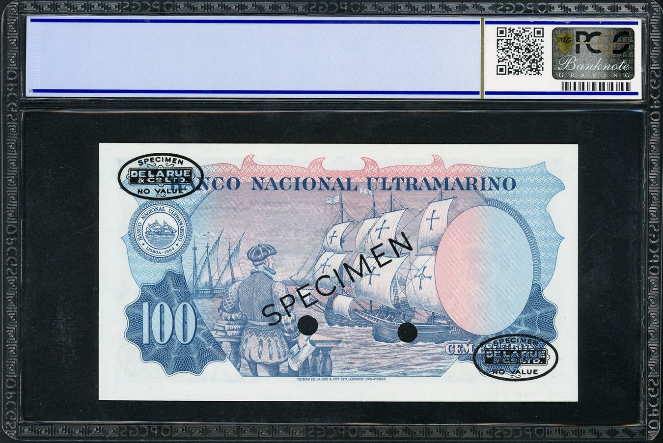 Lot of five Portuguese India, Banco Nacional Ultramarino, specimen notes, 2-1-1959. SCWPM-46s, 45s, 44s, 43s, 42s. 1,000 escudos, two POCs, specimen number 55, certified PCGS Superb Gem UNC 67 OPQ, PCGS #80296506; 600 escudos, two POCs, specimen number 43, certified PCGS Superb Gem UNC 67 OPQ, PCGS #80296490; 300 escudos, two POCs, specimen number 51, certified PCGS Superb Gem UNC 67 OPQ, PCGS #80296478; 100 escudos, two POCs, specimen number 64, certified PCGS Gem UNC 65 OPQ, PCGS #80296511; 60 escudos, two POCs, specimen number 52, certified PCGS Superb Gem UNC 67 OPQ, PCGS #80296513. High grade set with vivid coloring and designs.