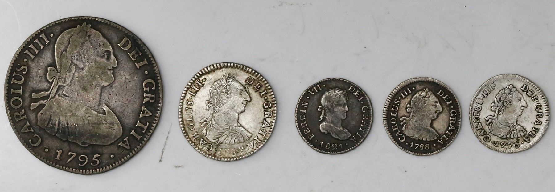 Lot of five Potosi, Bolivia, bust minors: 4R, 1795PR; 1R, 1777PR; 1/2R, 1776JR, 1788PR, 1821PJ.
