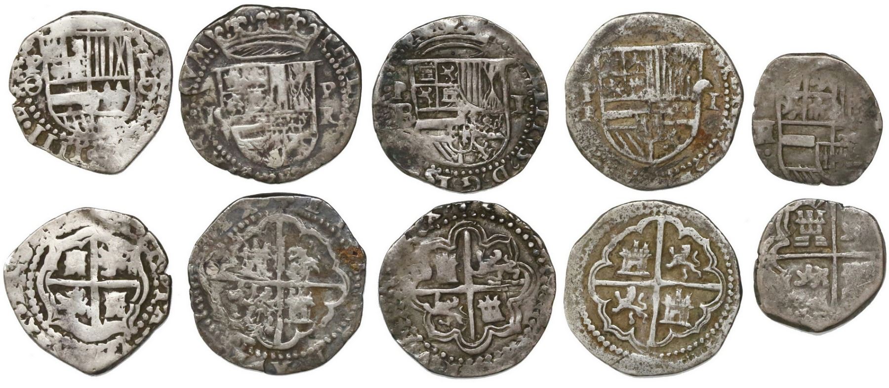 Lot of five Potosi, Bolivia, cob 1R of Philip II through Philip IV, assayers R (2), B/L, FR and O. 16.30 grams total. A rather interesting lot (all toned Fine or better with good crosses and shields and clear assayers), as each item has some special value, including R (Rincon, first issue of the mint) to right and left, assayer B over L (scarce), assayer FR (scarce, also on a small flan), and assayer O with I-O over I to right (first example we have seen). SEE INTERNET FOR PHOTO.
