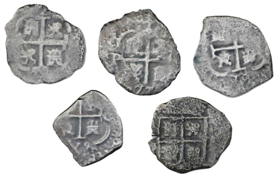 Lot of five Potosi, Bolivia, cob 2 reales, Philip IV and Charles II, various dates and assayers. 13.54 grams total. Generally good crosses and pillars with nice toning despite thinning from corrosion, one actually a 1652 Transitional (date not visible), McLean Type I. With HRC photo-certificates #5129, 5131, 5134 and 5135 and ROBCAR photo-certificate #M180160. Recovered from: Consolacion, sunk in 1681 off Santa Clara Island, Ecuador