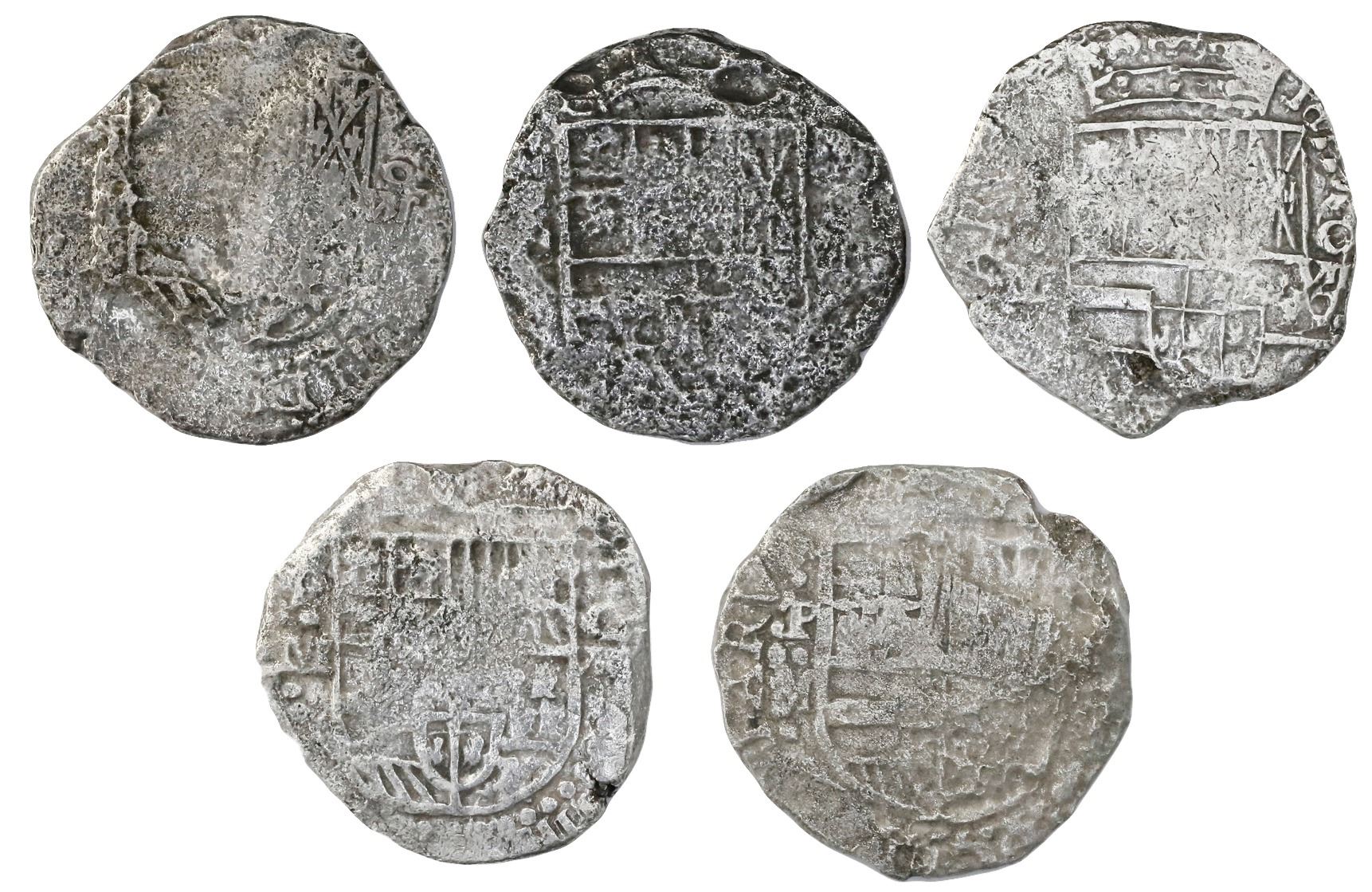 Lot of five Potosi, Bolivia, cob 8 reales, Philip III, various assayers (where visible), Grade 3, with HRC replacement certificates. KM-10. 108.78 grams total. Moderate corrosion but generally good shields and crosses, three with clear assayer M. With Fisher tags and HRC replacement certificates #105341, 160584, 187058, 187064 and 187067. Recovered from: Atocha, sunk in 1622 west of Key West, Florida.