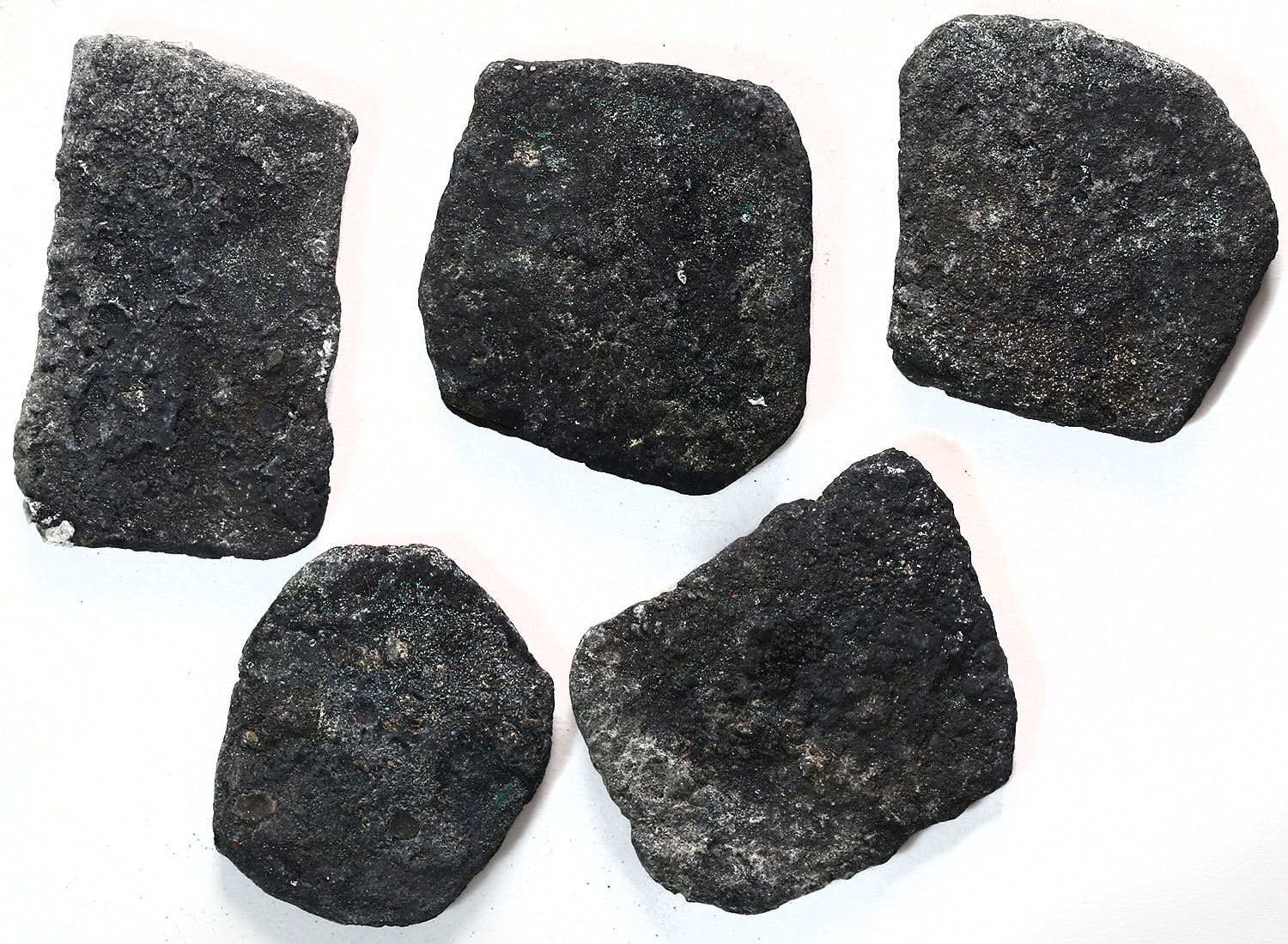 Lot of five cob 8R "blackies" (oxidized, as found), probably Mexican, Charles II and/or Philip V. 82.50 grams total. Dark black encrusted coins as originally found. From: Spanish 1715 Fleet, east coast of Florida
