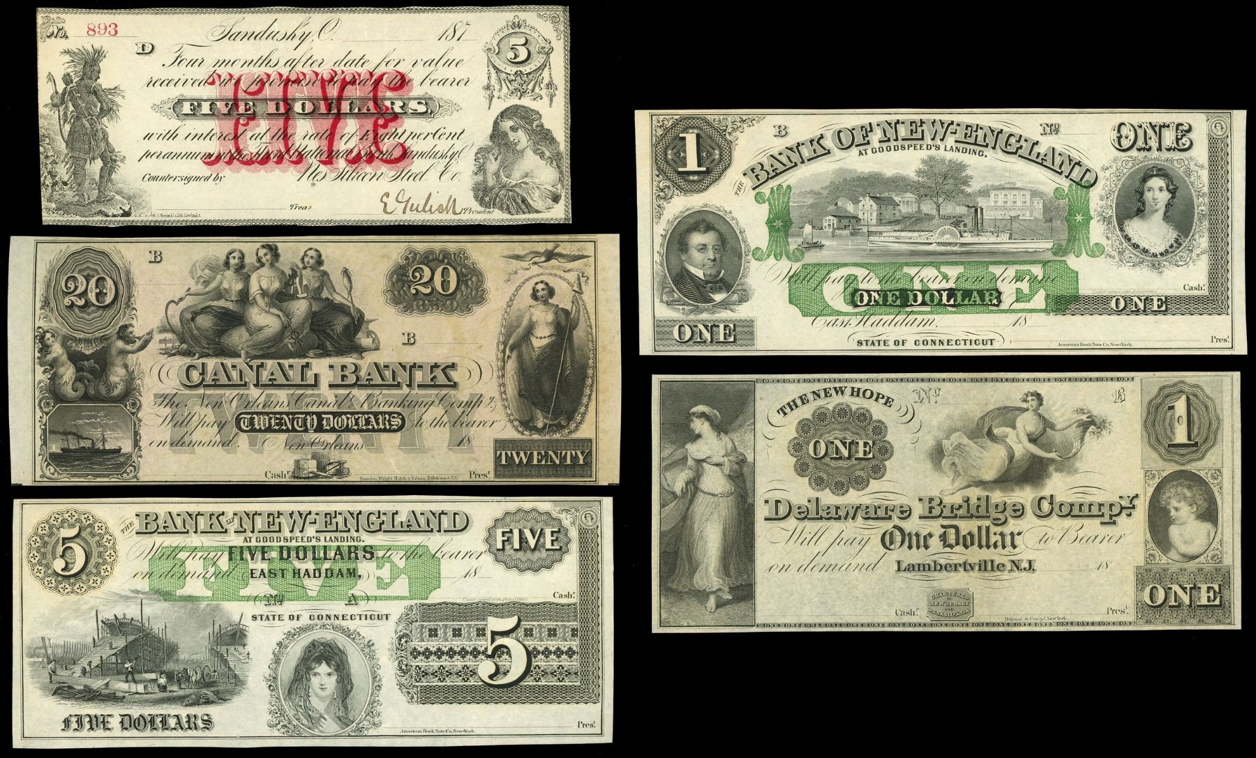Lot of five obsolete remainder notes, mid-1800s. Sandusky, Ohio, Nes Silicon Steel Co., $5, 187X, serial 893, UNC; East Haddam, Connecticut, Bank of New England at Goodspeed's Landing, $5, 18XX (1850s), UNC; East Haddam, Connecticut, Bank of New England at Goodspeed's Landing, $1, 18XX (1850s), choice UNC; Lambertville, New Jersey, Delaware Bridge Company, $1, 18XX (1840s), AU+ with light handling at upper left corner; New Orleans, Louisiana, Canal Bank, $20, 18XX (mid-1800s), UNC.