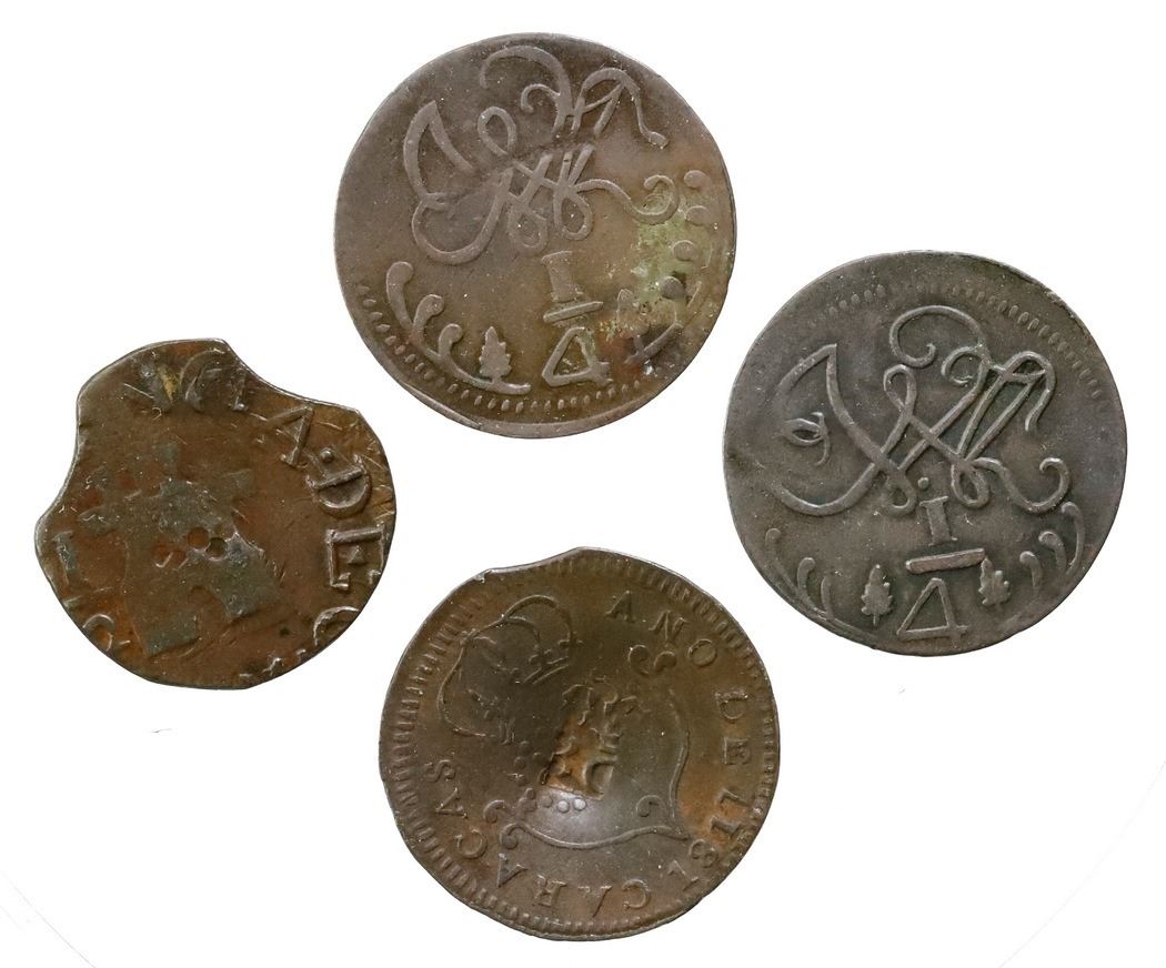 Lot of four Caracas, Venezuela, copper 1/2R (1817?) and 1/4R (1814 and 1817 [two]). The 1/2R has a fascinating double-clip error, and one of the 1/4R 1817 has an unidentified Arabic-script countermark (Rulau-DF69).
