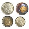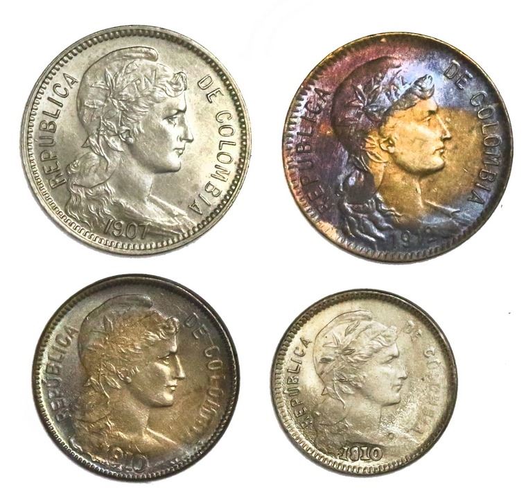 Lot of four Colombia copper-nickel papel moneda coins: 5 pesos, 1907AM and 1912-H; 2 pesos, 1910AM;