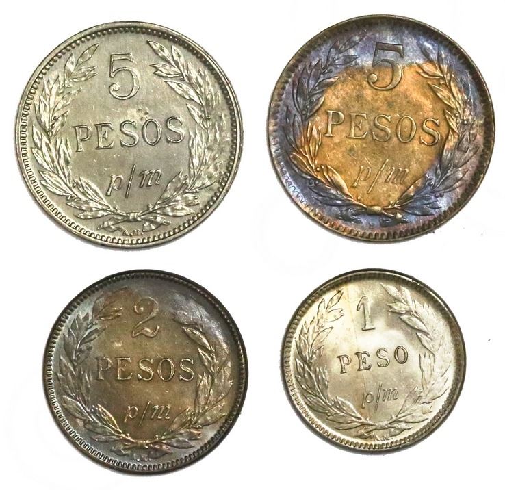 Lot of four Colombia copper-nickel papel moneda coins: 5 pesos, 1907AM and 1912-H; 2 pesos, 1910AM; 1 peso, 1910AM. Restrepo-366.1, 366.4, 353.2, 345.2; KM-279, B279, A279. 13.07 grams total. The 1912 5 pesos is AU while the other three grade Mint State, faint hairlines on all but the 1910 peso.