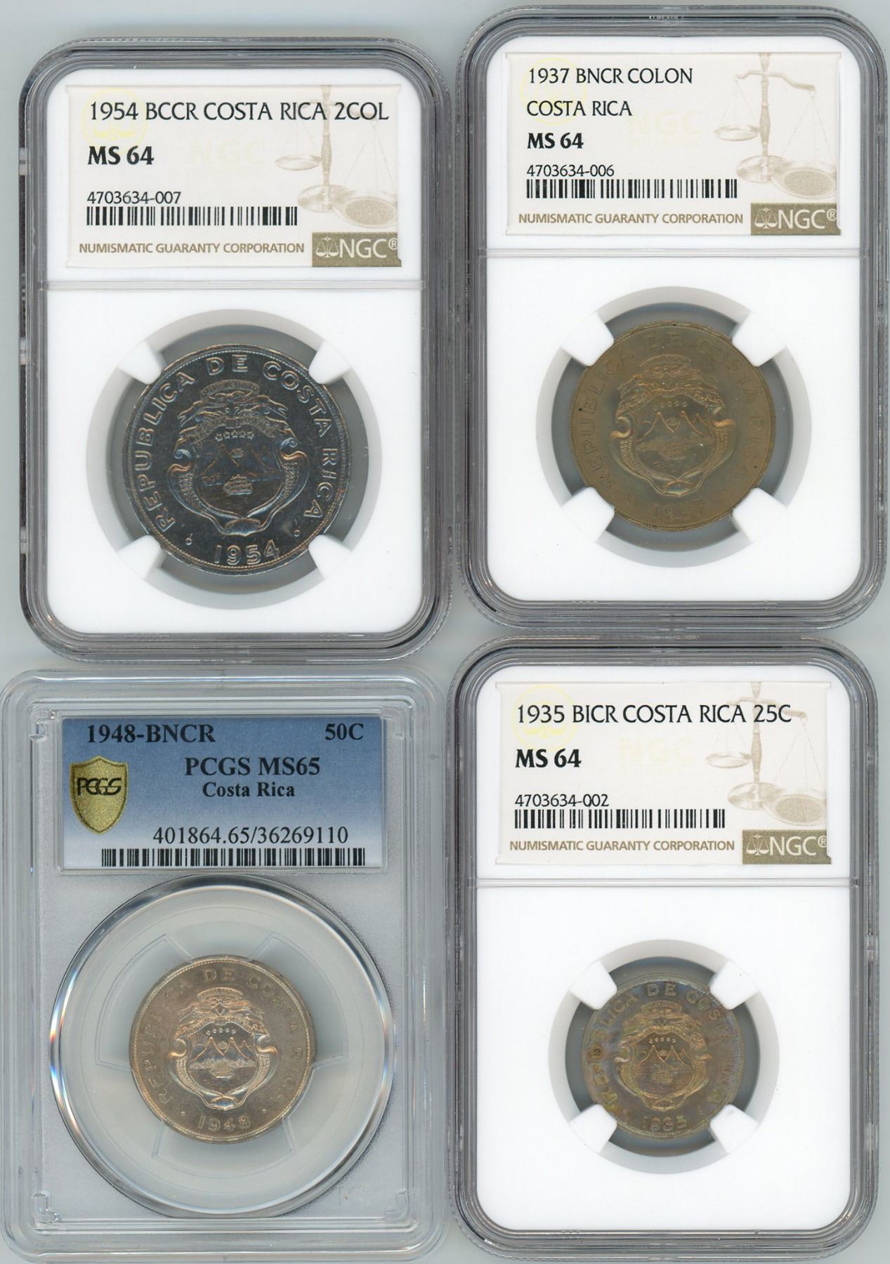 Lot of four Costa Rica coins: 2 colones, 1954, NGC MS 64; 1 colon, 1937, NGC MS 64; 50 centimos, 1948 PCGS MS65; 25 centimos, 1935, NGC MS 64. KM-187.1, 177, 183, 171. Nice set of four mid-1900s Costa Rican coins in high grades. NGC #4703634-002, -006, -007; PCGS #36269110.
