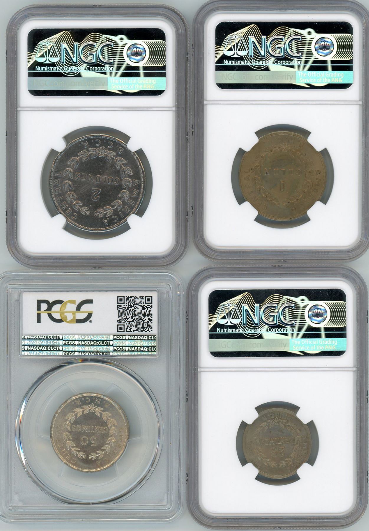 Lot of four Costa Rica coins: 2 colones, 1954, NGC MS 64; 1 colon, 1937, NGC MS 64; 50 centimos, 194