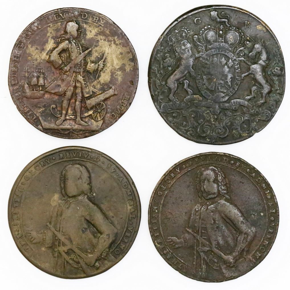 Lot of four Great Britain copper-alloy medals of Admiral Vernon, 1739, Porto Bello (various types). 66.97 grams total. Generally F-VF, some minor surface problems on a few.