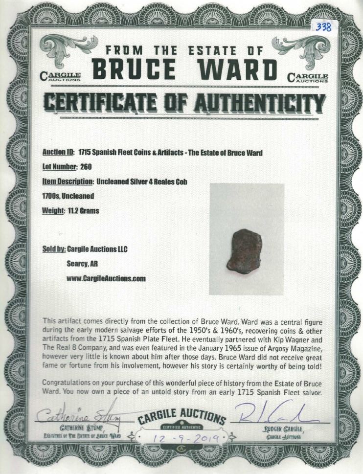 Lot of four Mexico City, Mexico, cob 4 reales "greenies" (encrusted as found), ex-Ward. 42.95 grams total. Mostly solid coins with varying degrees of encrustation (green, gray and orange) and appended small debris (uncleaned), practically no details visible. Pedigreed to the Bruce Ward collection (Cargile auction of December 2019, lots #260, 263, 266 and 269), with photo-certificates.Recovered from: Spanish 1715 Fleet, east coast of Florida