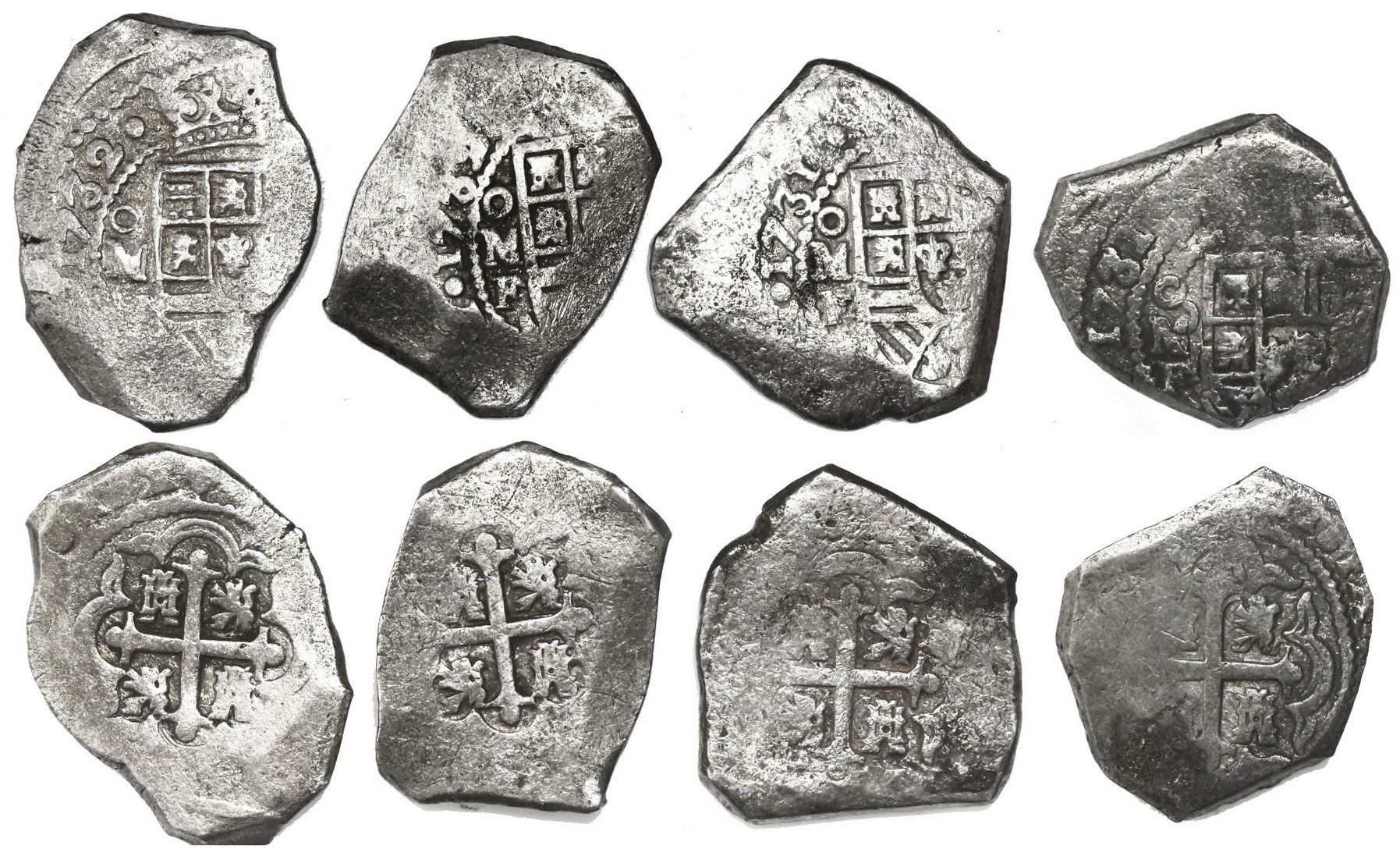 Lot of four Mexico City, Mexico, cob 8 reales, dated 1731 and 1732, assayer F. S-M26; KM-47a. 105.89 grams total. Solid coins with generally good shields and crosses but also clear dates and assayers, minimal surface corrosion, lightly toned. Recovered from: Vliegenthart, sunk in 1735 off Zeeland, the Netherlands