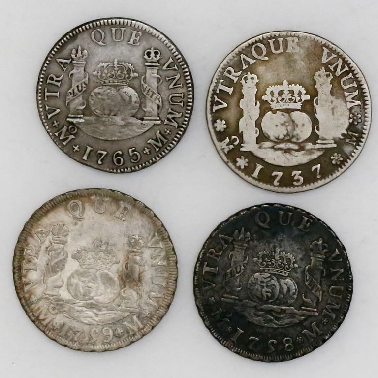 Lot of four Mexico City, Mexico, pillar 2 reales, various kings and dates: 1737MF, 1758M, 1759M and 1765M. 25.46 grams total. AVF to XF, mostly toned, one lustrous from cleaning, no big problems.