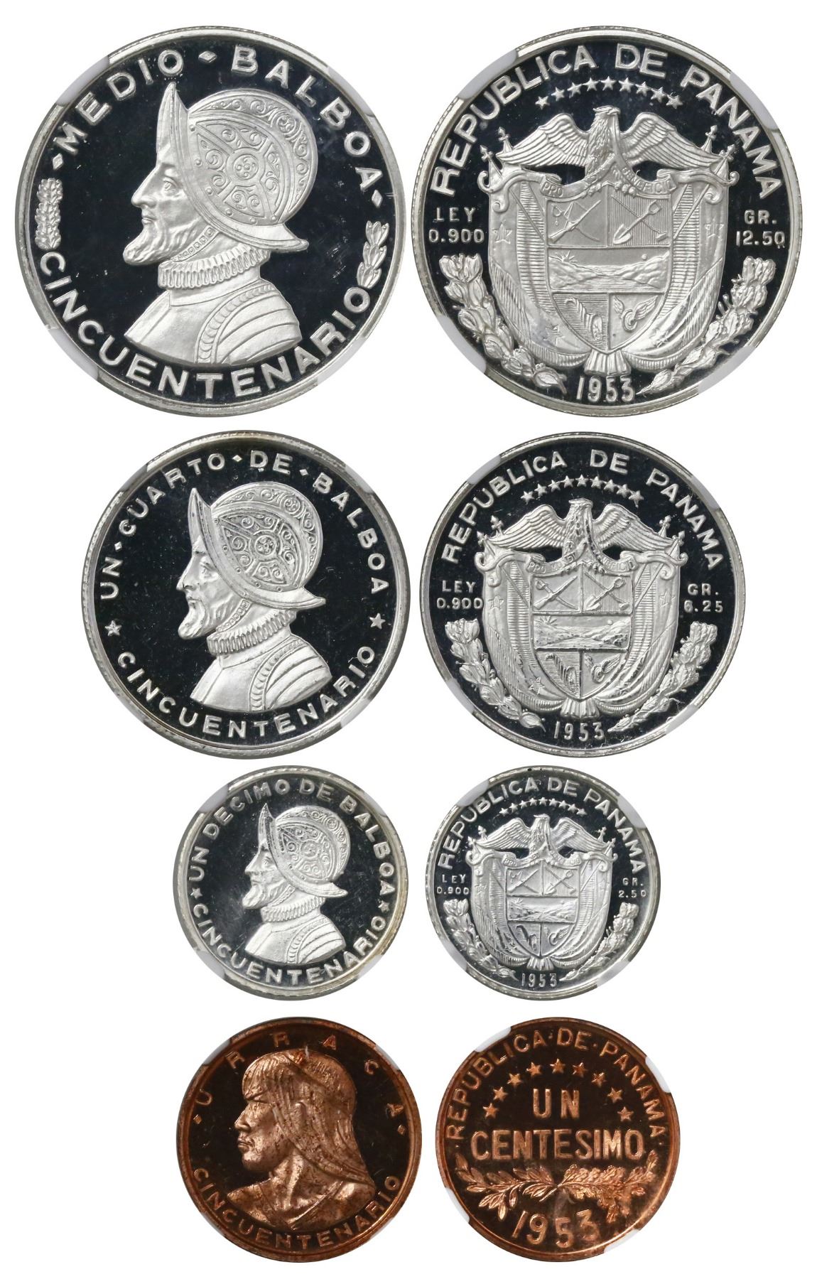 Lot of four Panama proofs of 1953, Republic Anniversary, rare, in NGC slabs (all finest known): 1/2 balboa PF 67 Ultra Cameo; 1/4 balboa PF 67 Ultra Cameo; 1/10 balboa PF 67 Ultra Cameo; bronze 1 centesimo PF 65 RD Ultra Cameo; ex-Richard Stuart (stated inside the slabs). KM-20; 19; 18; 17. Beautiful cameos with bright mirror fields, with finest-known status in NGC census as follows: 1/2 balboa (NGC #4427875-007) tied with one other; 1/4 balboa (NGC #4427875-009) single finest known; 1/10 balboa (NGC #4427875-010) single finest known; 1 centesimo (NGC #4427875-011) finest and only specimen. Pedigreed to the Richard Stuart collection.