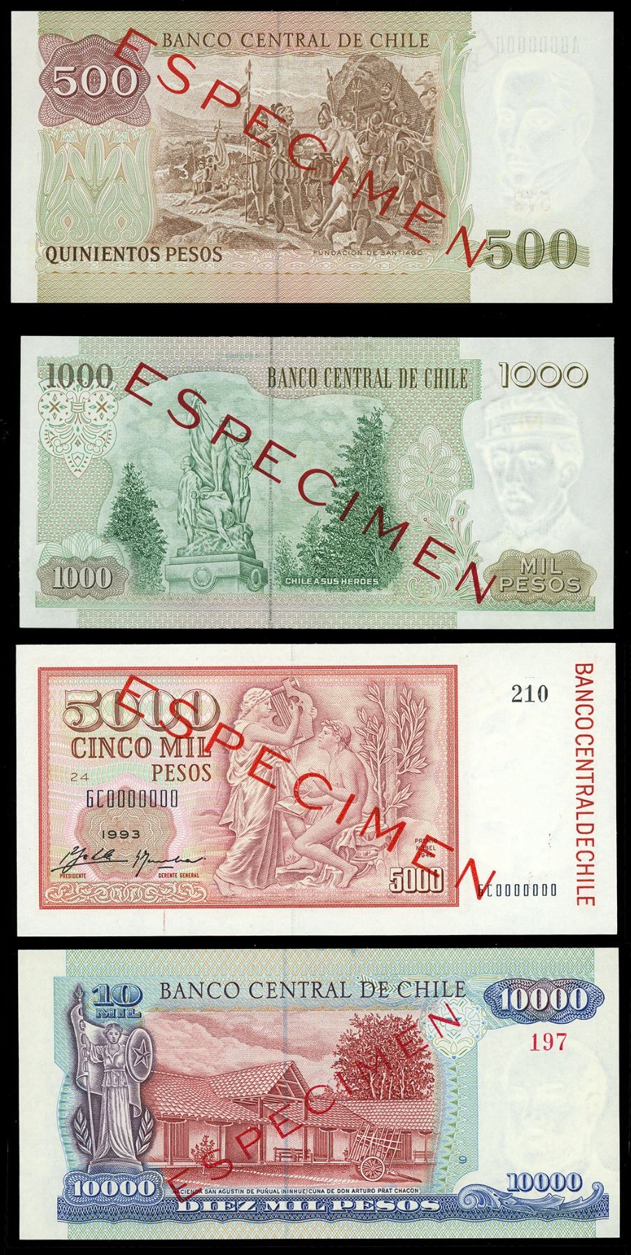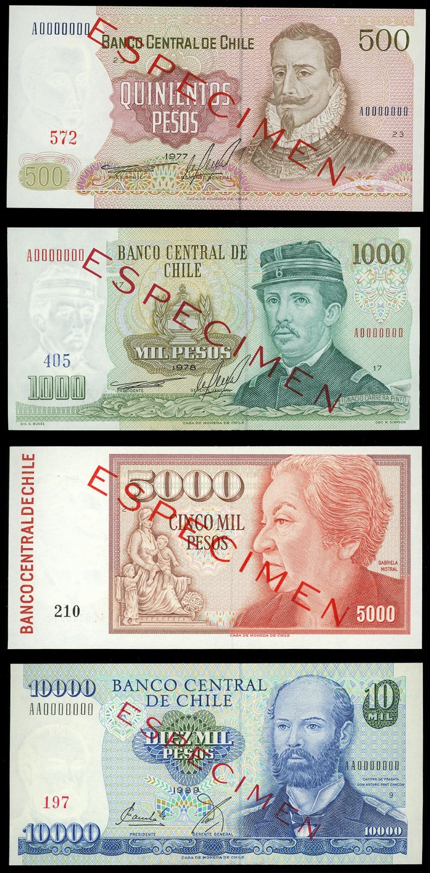 Lot of four Santiago, Chile, Banco Central, specimen pesos in leather display portfolio: 10,000 pesos, 1989; 5,000 pesos, 1993; 1,000 pesos, 1978; 500 pesos, 1977. SCWPM-156s, 155s, 154s, 153s. Rare set of Crisp Uncirculated, high-denomination specimen notes issued by the Banco Central. With original Banco Central de Chile imprinted leather display portfolio.
