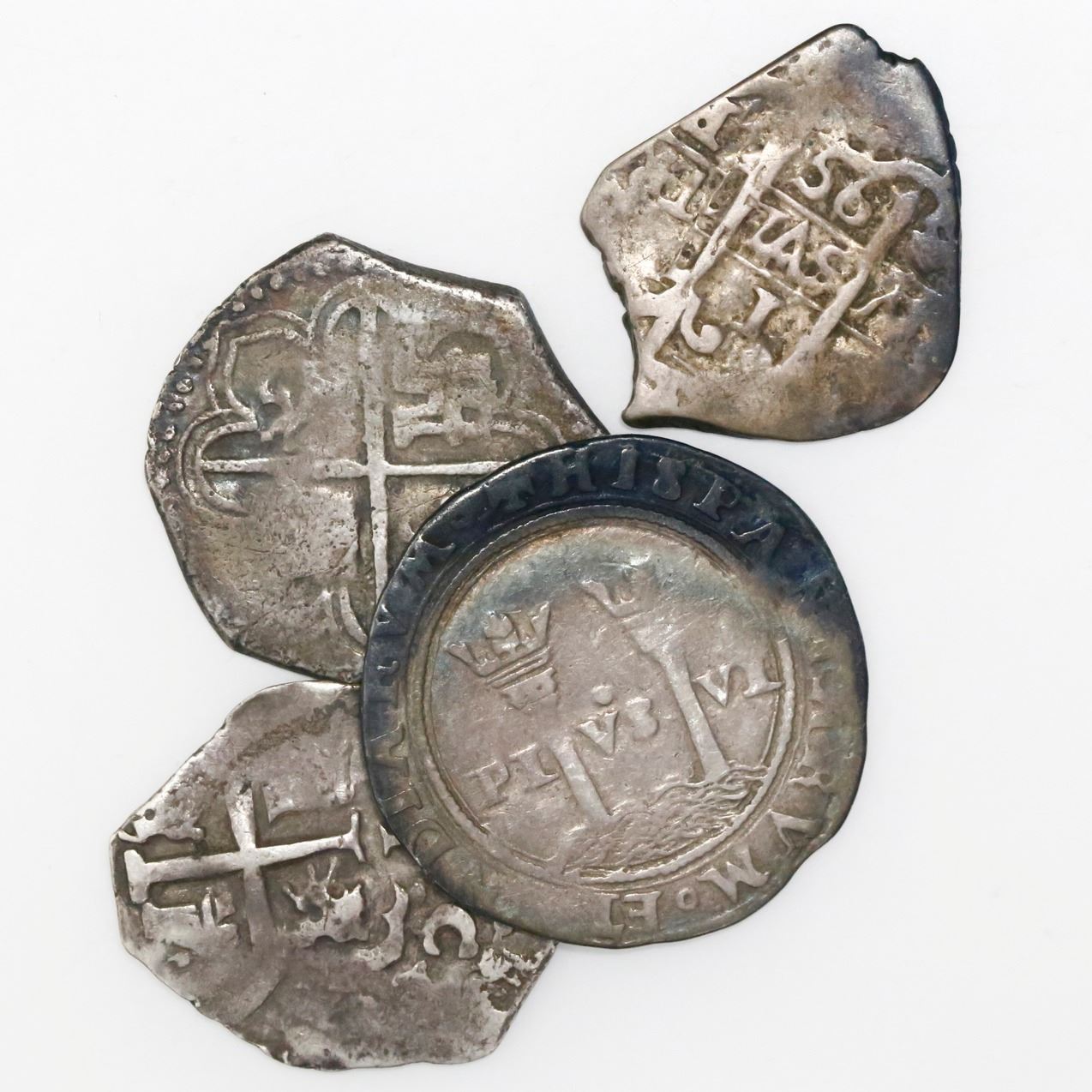 Lot of four Spanish / Spanish colonial cob 1R, various mints and periods: Mexico Charles-Joanna M-L; Lima 1690R; Potosi 1695VR; Seville 15(8?). 10.81 grams total. All toned and decently detailed, Fine or better, the Seville cob is plugged at top of shield.
