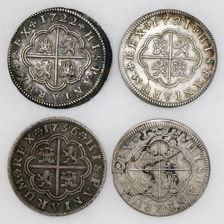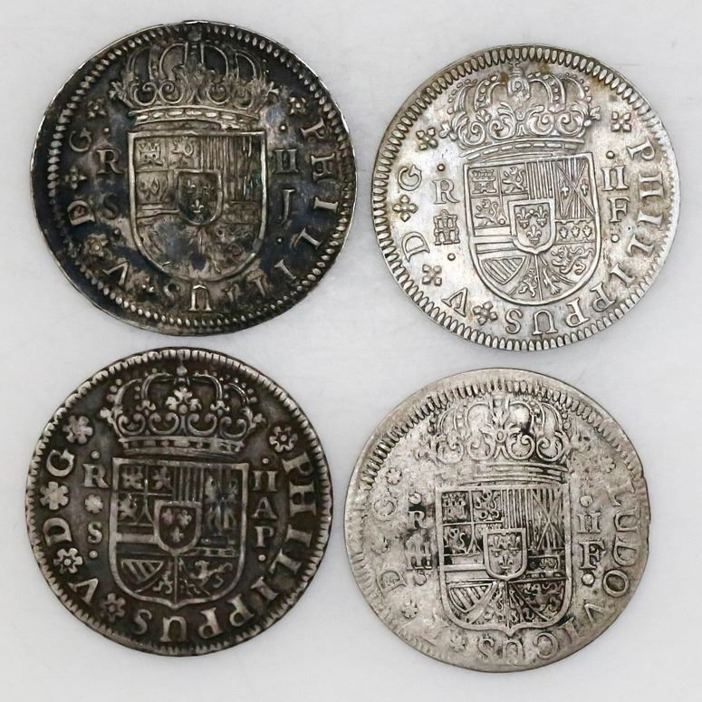 Lot of four Spanish milled 2 reales  pistareens  of Louis I and Philip V: Segovia, 1721F and 1724F;