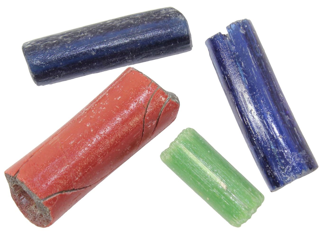 Lot of four Venetian glass tubular trade beads. Box 4-1/4" x 3-1/4", beads 3/4" to 1" long. The inbound early wrecks in the Caribbean (as well as some land sites) tend to be littered with these beads, which were generally traded to the natives and therefore were a sort of money, this group consisting of cylinders of blue, green and red. From the "Pewter wreck" (mid-1500s), housed in Riker box, with photo-certificate from the salvagers.